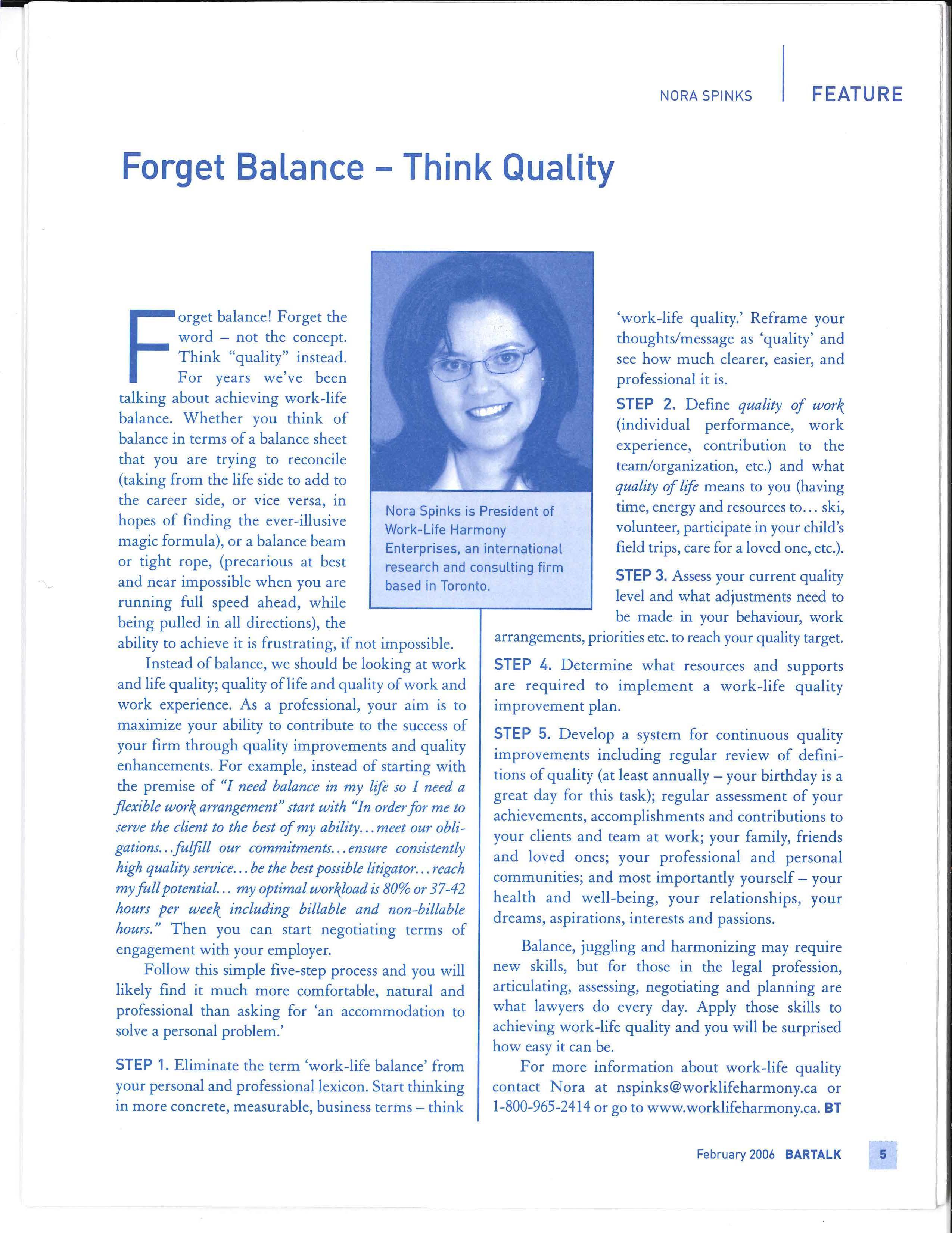 For more information about work-life quality contact Nora at nspinks@worklifeharmony.ca or 1-800-965-2414 or go to www. worklifeharmony.ca. BT