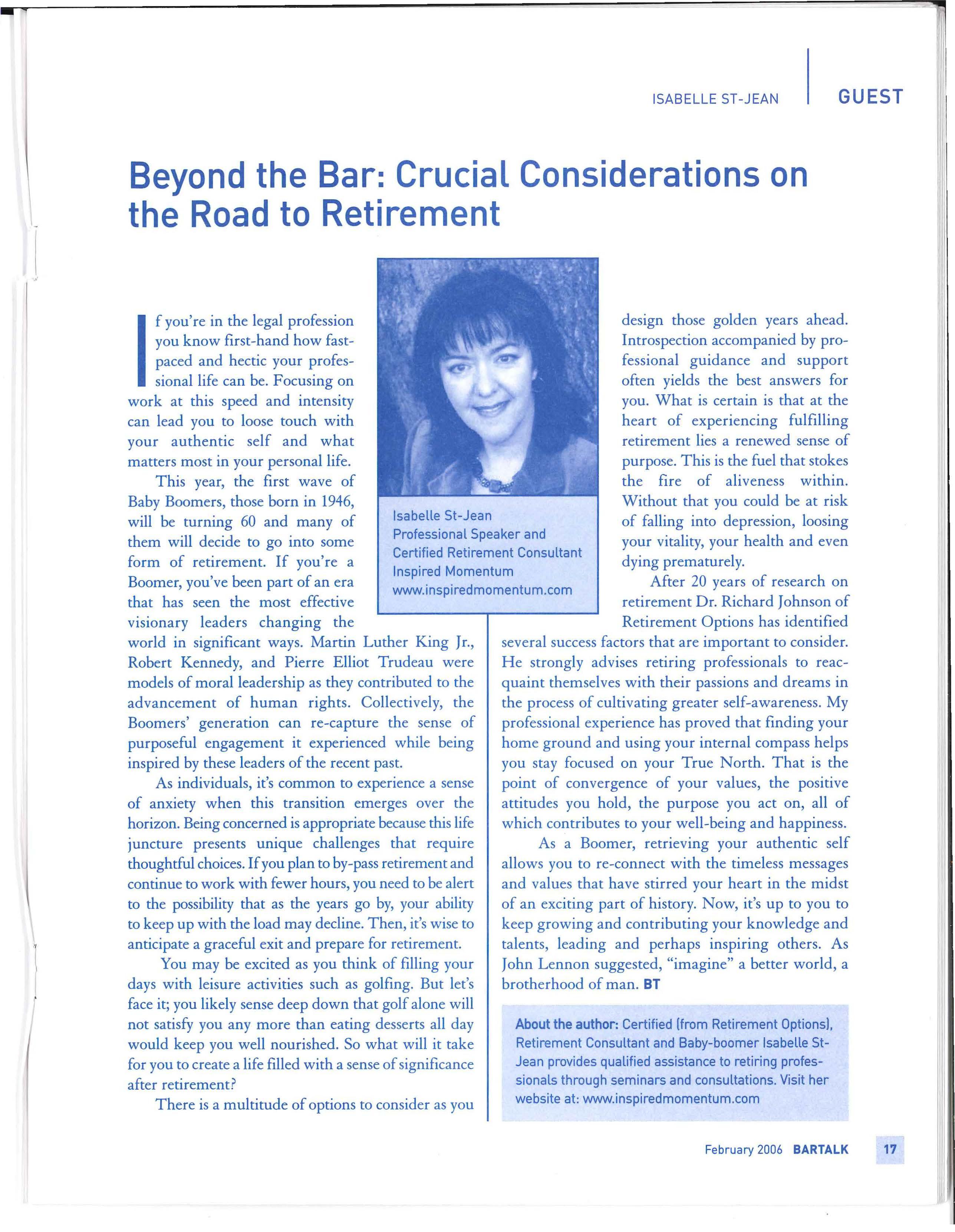 take a look at healthier lifestyles for lawyers, identified in a recent Ipsos-Reid poll as the # 1 concern among lawyers From retirement and insurance planning to stress relief and helping others - 8 guest contributors join our regular columnists in exploring this topic.