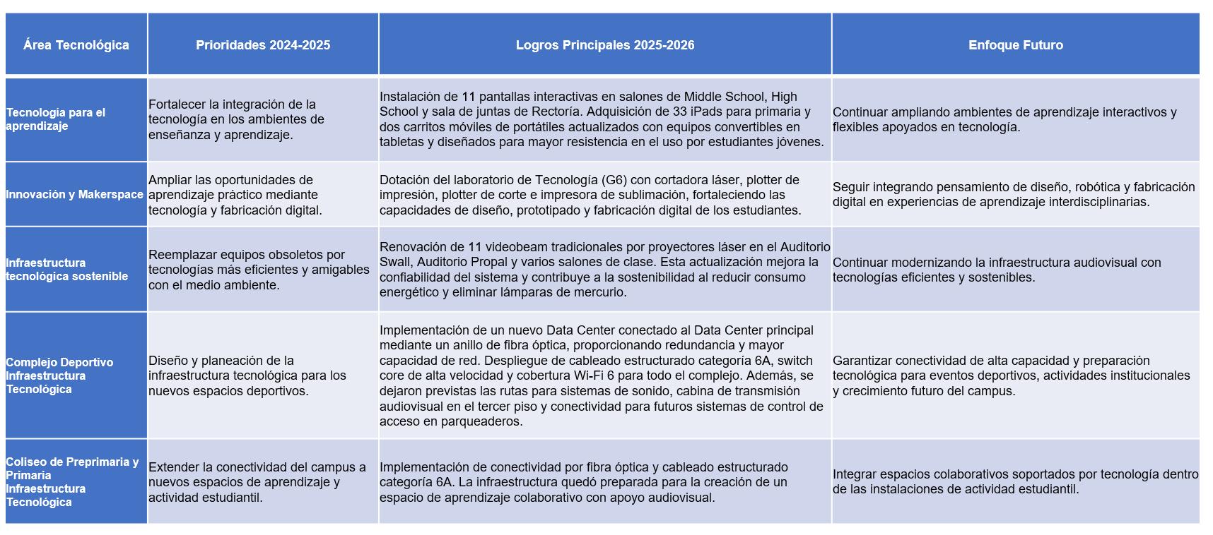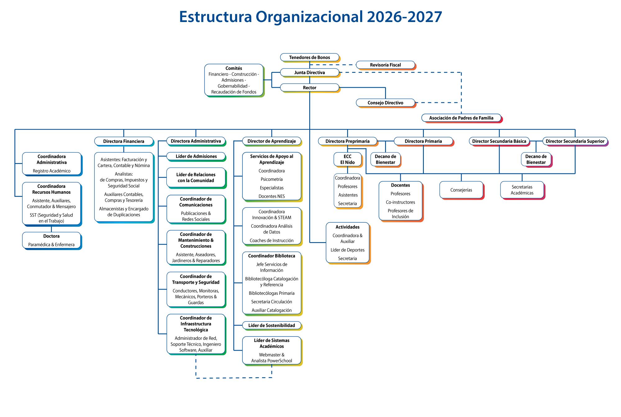El programa extracurricular, en constante expansión, ofrece oportunidades para reforzar las lecciones aprendidas en el aula y aplicar las habilidades en un contexto del mundo real. Con casi 600 estudiantes, el programa de actividades extracurriculares es sólido, divertido y competitivo. Nuestros alumnos participan con éxito en torneos locales y nacionales. He señalado sólo algunos aspectos destacados de cada una de las secciones. Los directores de sección, el Dr. David Fayad, Director de Enseñanza y Aprendizaje, y la Sra. Mathilde de Guzmán, Directora del Desarrollo y Bienestar Comunitario, han presentado informes para cada una de sus secciones. Cada uno de los informes de sección refleja los objetivos específicos y las iniciativas de desarrollo diseñadas para los alumnos. Cada sección ha indicado algunos de los retos que han aparecido a lo largo del tiempo y las acciones y estrategias que se están aplicando actualmente para abordarlos. Bajo la atenta y sabia dirección de la Coordinadora de Convivencia Escolar, continuamos perfeccionando y mejorando las intervenciones individuales y grupales en respuesta a los conflictos y problemas de comportamiento de acuerdo con la ley educativa colombiana. Continuamos adoptando el uso seguro y ético de la tecnología en el proceso educativo. El equipo de TIC está liderando la comprensión y el uso de la inteligencia artificial en todo el plan de estudios. El informe del plan a largo plazo incluye información sobre el plan estratégico, el proceso de mejoramiento continuo, las instalaciones y los programas, así como información sobre tecnología, el plan maestro de infraestructura y mejoras y las necesidades de personal.