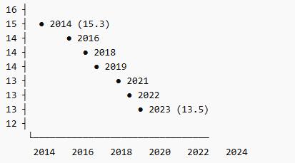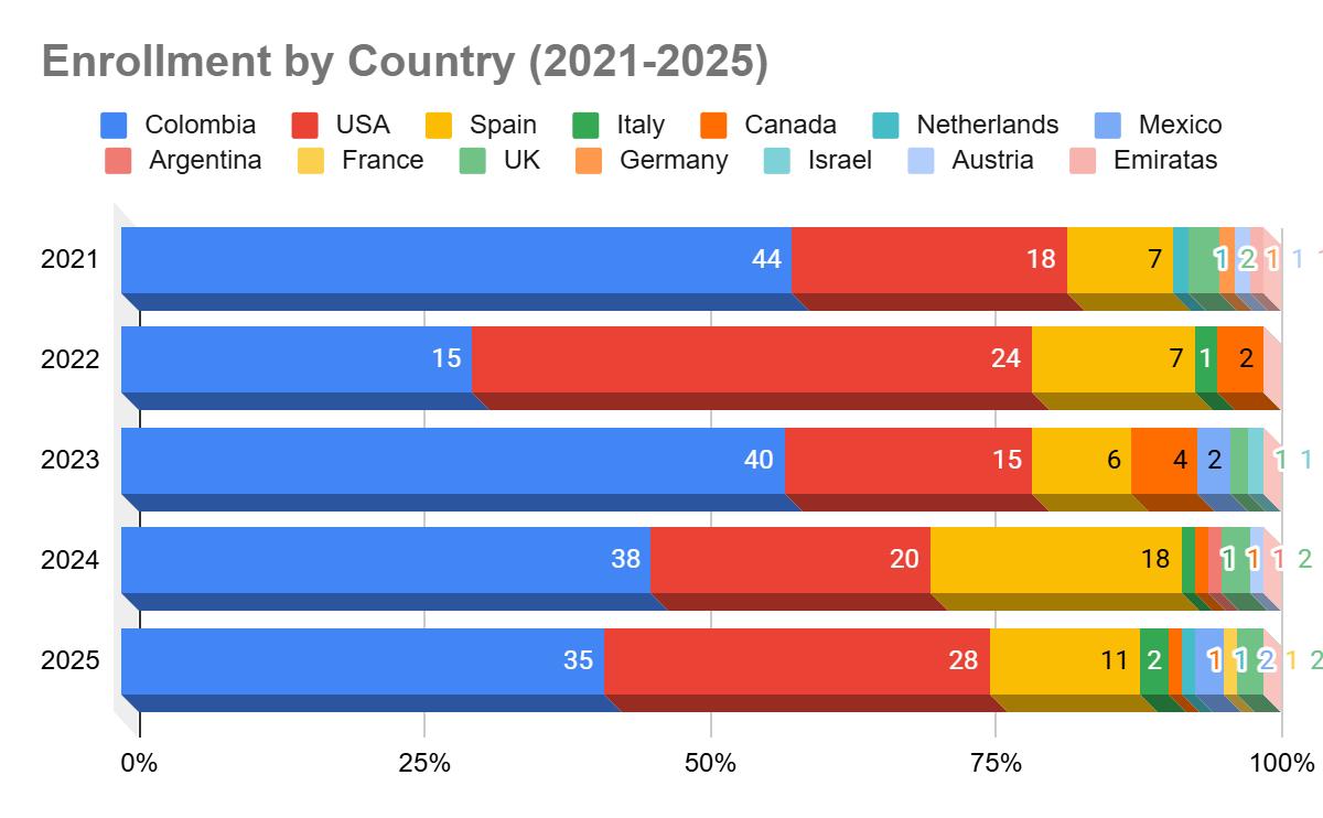 In Colombia, the birth rate has been steadily declining over the past decade. It decreased from approximately 15.3 births per 1,000 inhabitants in 2014 to around 13.5 in 2023, representing a reduction of about 10%. This trend reflects broader demographic changes in the country, including delayed parenthood, shifting family planning decisions, and socioeconomic factors that influence fertility patterns. These dynamics are important to consider when projecting future student populations and planning long-term educational infrastructure and capacity.