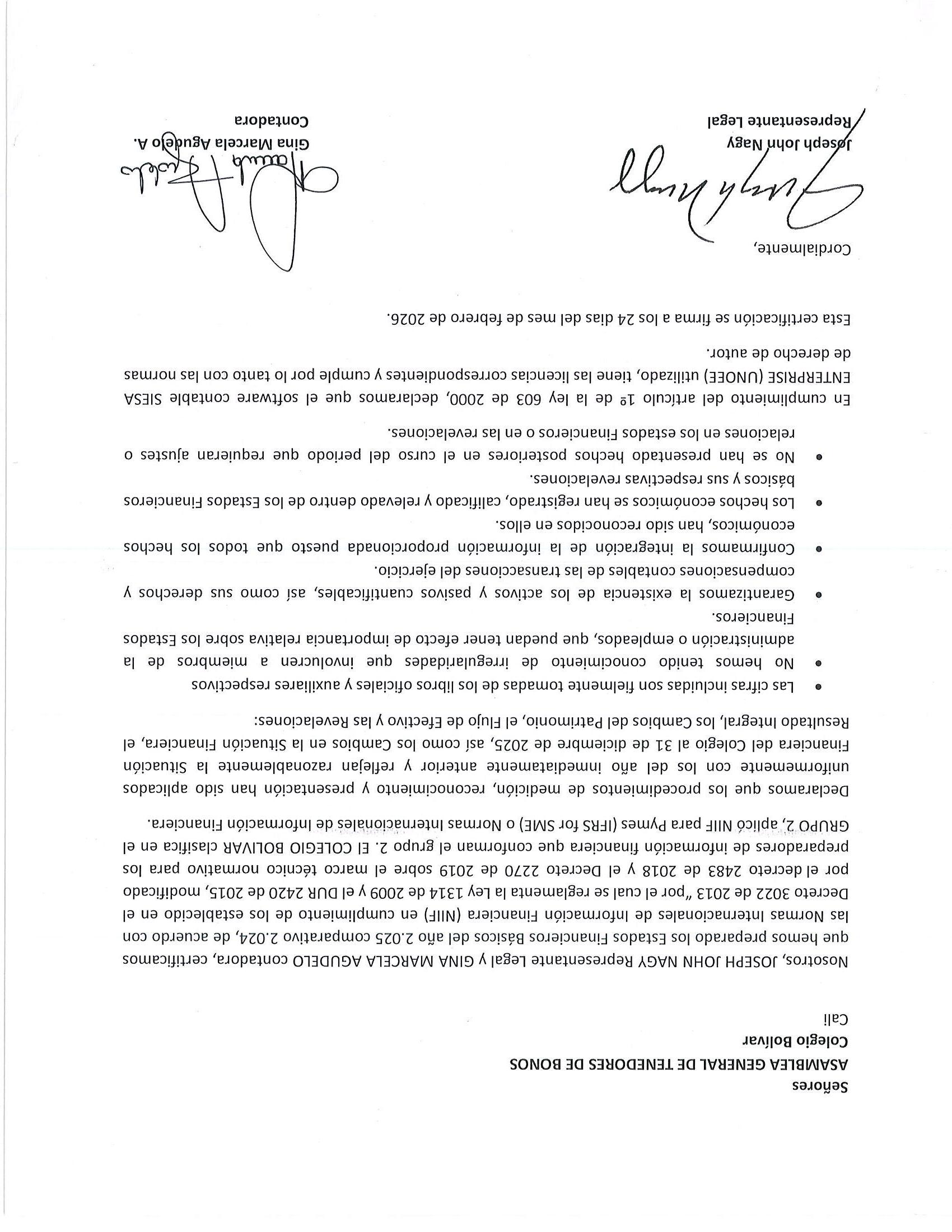 La Asamblea Ordinaria de Tenedores de Bonos del Colegio Bolívar se llevó a cabo el martes, 18 de marzo de 2025, en el Auditorio Propal de la Biblioteca del Colegio Bolívar. De acuerdo con el Art. 6 de los estatutos, la Sra Mariana Caicedo, Presidente de la Junta Directiva del Colegio Bolívar, abrió la sesión a las 7:35 a.m. Ejercerá funciones como Secretario para esta Asamblea, el Dr. Joseph J. Nagy, Rector del Colegio Bolívar.