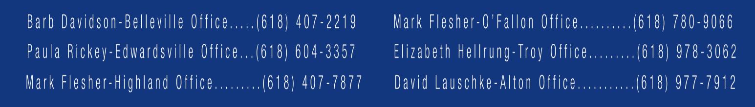 Our 6 offices in Belleville, Edwardsville, Alton, Highland, O’Fallon and Troy are open 7 days a week. The brokers in our offices offer the best local hometown service while our organization can provide the benefits of a large company with full time managing brokers, support staff and corporate support. Our REALTORS will handle residential, development, commercial and agricultural real estate as well as property management. Stop by and see us!
