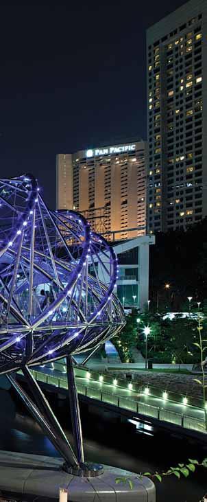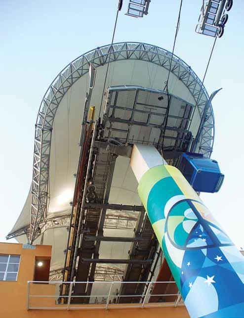 As duas monumentais torres de 64 m e 26 m, respectivamente, e seus elevadores panorâmicos mudaram a estética da região do Morro do Cantagalo. Na página ao lado, intersecção das passarelas suportadas por um único pilar cilíndrico