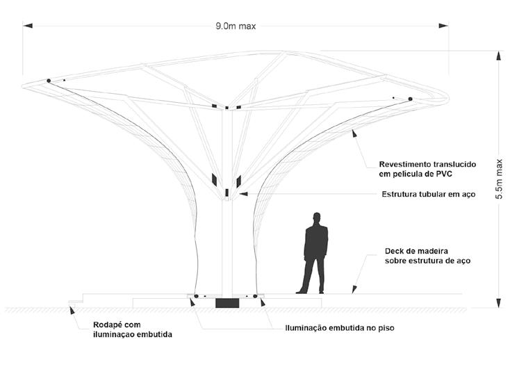 As duas primeiras são compostas por três elementos: as membranas de cobertura, as estruturas metálicas e cabos de