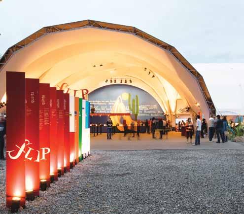 Acima, tenda dos autores com estrutura em aço. Auditório para quase 1.000 pessoas, cabines de tradução, palco, acesso independente dos autores etc. Abaixo, tenda com foyer de acesso ao evento. À direita, tenda de cobertura dos telões, na margem do Rio Perequê-Açu