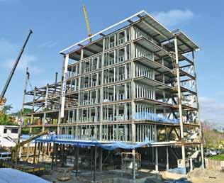 6 Após a montagem dos perfis estruturais de aço da fachada, estes recebem revestimento de placas cimentícias