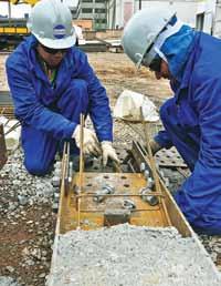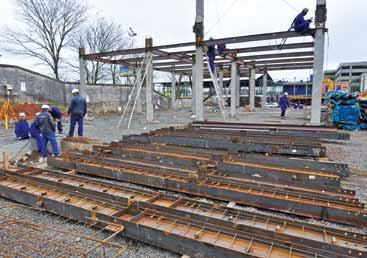 1 Os perfis metálicos dos pilares, já com os conectores de cisalhamento, são preparados para a concretagem no próprio canteiro