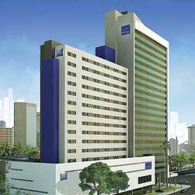 Para garantir agilidade à obra do Hotel Ibis Canoas, a fachada, ao lado, foi executada com o sistema steel framing. Com 4.500 m2, a edificação é composta por pilares de aço preenchidos por concreto