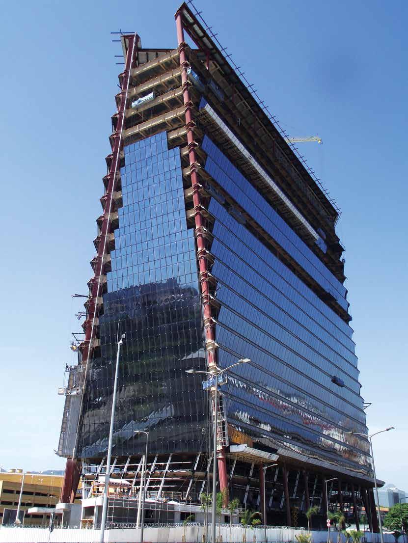 É neste cenário que o aço mostra toda a sua versatilidade, presente em diferentes soluções, como nos casos que selecionamos para esta edição de Arquitetura & Aço No projeto do consagrado arquiteto Norman Foster para o edifício corporativo Pátio da Marítima, por exemplo, o aço foi essencial para viabilizar a execução da arrojada estrutura com pilares inclinados. Já no megaempreendimento Porto Atlântico Leste, complexo com três torres para usos distintos, além de um centro comercial, a adoção de uma solução estrutural mista, em aço e concreto, garantiu velocidade construtiva e redução de custos à obra. Temos, ainda, o caso do AquaRio, no qual um antigo armazém frigorífico foi transformado para receber o maior aquário marítimo da América do Sul, com área 22,8 mil m², tirando partido de estruturas em aço preexistentes.