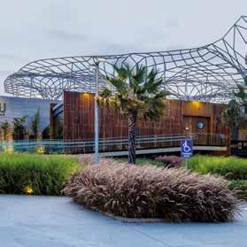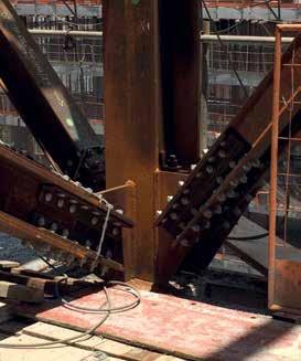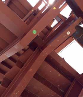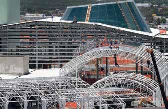 laje steel deck na cobertura. “A leveza estrutural das vigas e pilares metálicos, associada à sua alta capacidade de carga, permitiu o alinhamento vertical do auditório com os andares do edifício principal, e, ainda, possibilitou a ocupação da cobertura do bloco como área de convivência para os visitantes do edifício”, explica Deusdara. As vigas principais contam com perfis de aço laminado W 610 x 110 e apresentam uma relação entre vão e a altura de L/30.