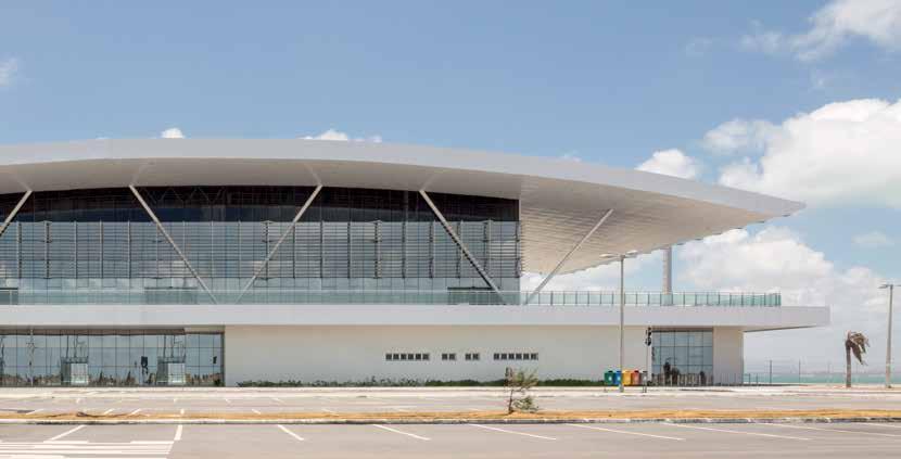 UMA CONSTRUÇÃO NA ORLA DE FORTALEZA, mais precisamente ao lado do Porto do Mucuripe, tem chamado a atenção dos turistas que desembarcam na tranquila Praia Mansa não só por suas dimensões, mas, especialmente, por suas bonitas formas, definidas por esbeltas estruturas em aço. Inaugurado em 2015, o Terminal Marítimo de Passageiros da capital cearense foi idealizado pelo escritório Architectus S/S como uma espécie de novo cartão de visitas da cidade – reconhecida por receber cruzeiros marítimos de todo o mundo nos meses mais quentes do ano – e também para abrigar eventos privados no período de menor movimentação portuária, na baixa temporada. Por ser rota quase obrigatória e primeira parada de muitos dos navios vindos da Europa e dos Estados Unidos, a construção não deveria carregar simbolismos, mas se mostrar impactante o suficiente para marcar o primeiro contato com a cidade. “A Secretaria de Portos, junto à Companhia Docas do Ceará, contratante direta da licitação, solicitou uma estrutura marcante que evidenciasse o posicionamento do país para o visitante internacional. Por isso, optamos por algo dinâmico, geométrico e não orgânico, cujo conceito construtivo pudesse ser executado em curto prazo”, explica o arquiteto Ricardo Saboia, que viu na