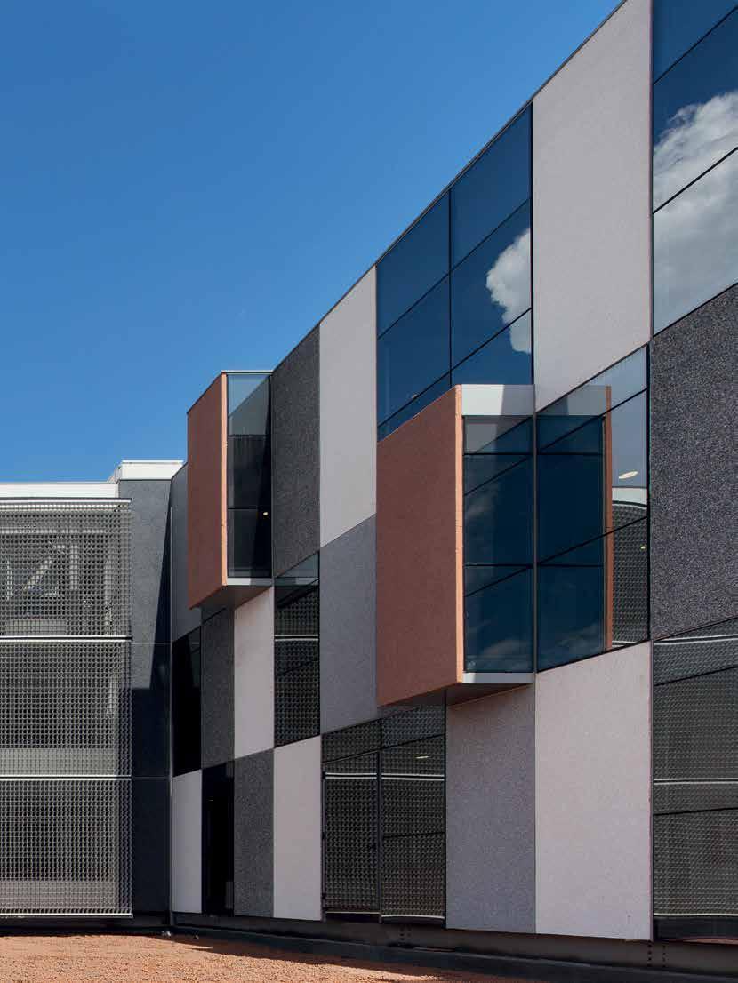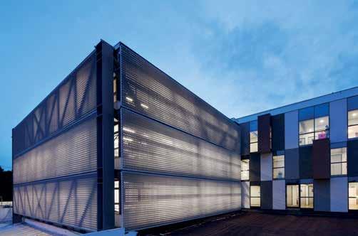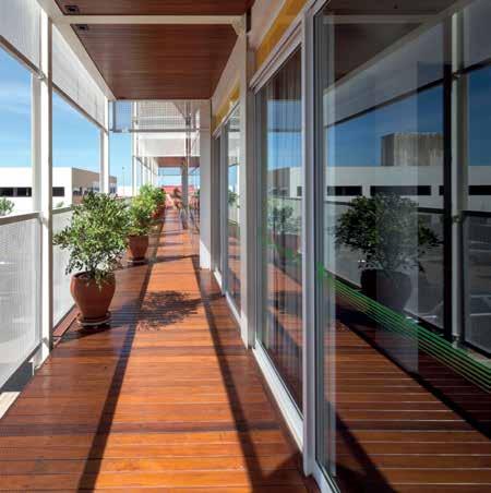 E a presença do aço não ficou restrita unicamente aos elementos estruturais da obra. Para conferir um aspecto mais esbelto à edificação e ainda agregar ventilação e iluminação naturais, brises metálicos foram instalados na fachada da universidade. Associados a placas de concreto coloridas e vidros reflexivos, formam uma composição elegante que confere identidade ao conjunto.