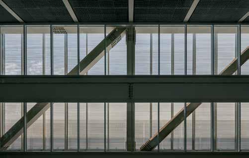 Brises em aço protegem o interior da incidência direta de raios solares, ao mesmo tempo que mantêm a iluminação natural e proporcionam boa ventilação ao edifício