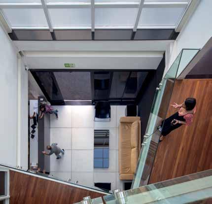 Na foto abaixo, átrio com pé-direito triplo, funciona como uma espécie de espinha dorsal que interliga os dois lados do edifício e favorece a integração das equipes. Ao lado, área de reuniões e trabalho das equipes de produção
