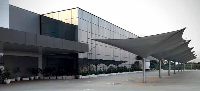 vagas sejam cobertas – dado o sol forte da região –, instalamos uma cobertura em balanço sobre o estacionamento, engastadas em pilares em V. Esta solução forma uma marquise que cumpre a função e, ao mesmo tempo, mantém relação com o design de um shopping”, explica Rondinelli.