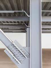 Por fim, contraventamentos verticais de tipo V nos perímetros das escadas e pórticos para fachadas – conjunto formado por vigas e pilares de aço conectados por meio de ligações resistentes a momento – dão estabilidade ao sistema. (G.G.) M