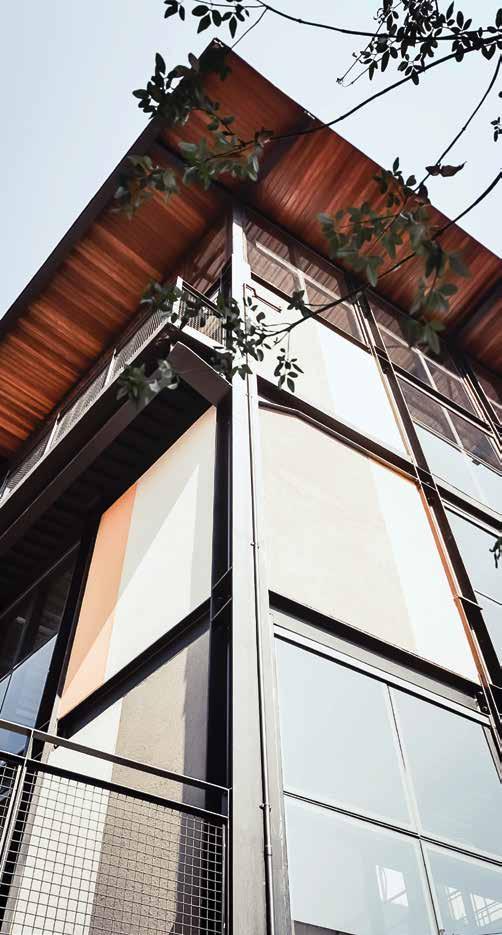 A fAchAdA do Edifício GAiA, localizado em um terreno de apenas 1,4 mil m2 no bairro do Morumbi, na zona sul de São Paulo, chama a atenção, mas é por trás dos brises metálicos pré-pintados em azul, verde e cinza que encontra-se o verdadeiro segredo da construção: uma estrutura em aço com fechamento em perfis galvanizados formados a frio, também chamados de LSF (light steel frame). “Foi uma solução muito interessante, pois com ela garantimos uma obra rápida, flexível e mais econômica em termos de consumo de energia”, explica o arquiteto Ovídio Rotger Armelin, do Technè Arquitetura. No projeto, os perfis de aço galvanizado servem de estrutura para quatro camadas que fazem a função de fechamento junto às esquadrias e vidros: uma chapa cimentícia por fora, uma barreira de vapor, painéis em OSB (Oriented Strand Board) e fechamento interno em gesso. Os brises, por sua vez, serviram como uma segunda pele para o prédio, reduzindo em até 40% a incidência solar da fachada.