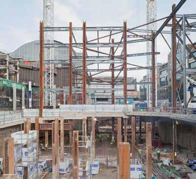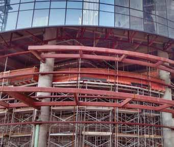 com uma defasagem de seis pavimentos entre uma etapa e outra. Uma terceira frente executou a proteção passiva contra incêndio das vigas de aço, após a finalização da concretagem dos pilares dos primeiros seis pavimentos.