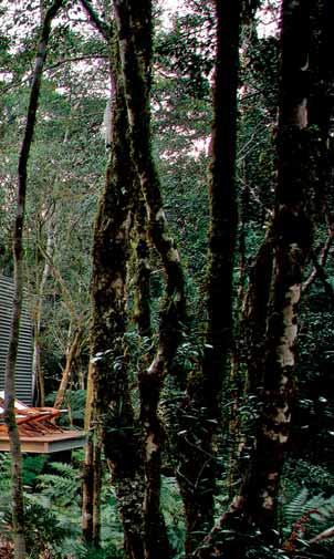 Para os volumes distintos, optouse por diferentes soluções estruturais, interligadas por meio de uma estratégia engenhosa: fundação e bases de concreto surgem do subsolo, dando sustentação para a plataforma térrea, construída do mesmo material; enquanto isso, a cota superior é estruturada com vigotas de madeira, apoia-