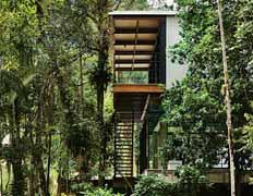 de veraneio. A estrutura mescla o aço, a madeira e o concreto e a edificação é suspensa do solo.