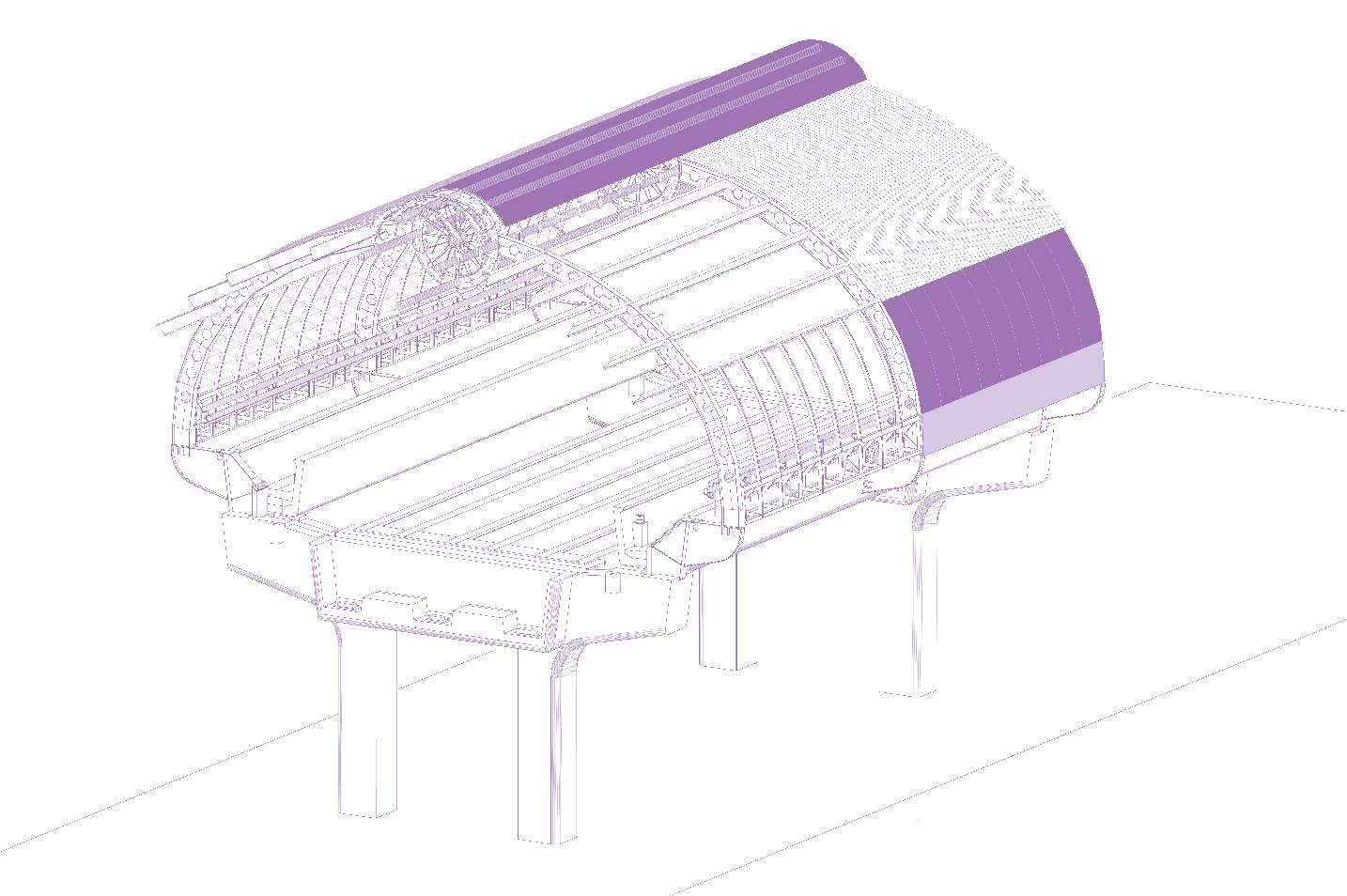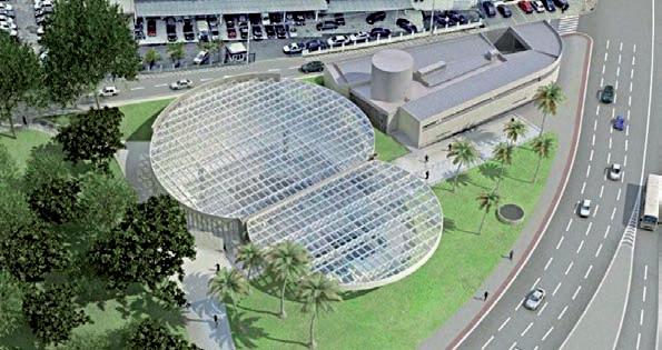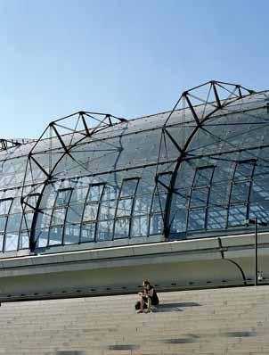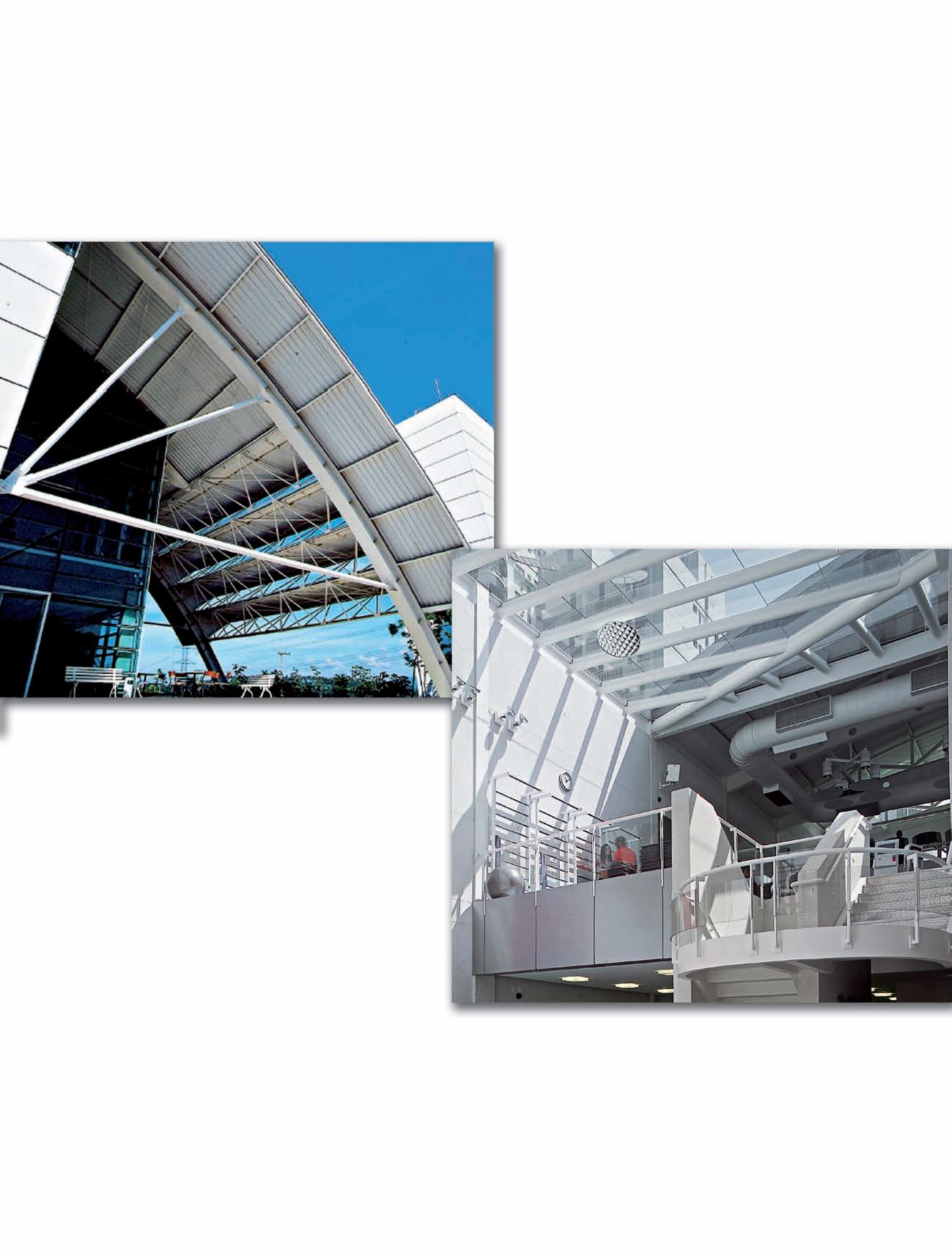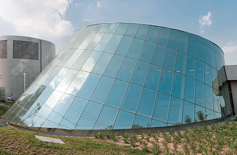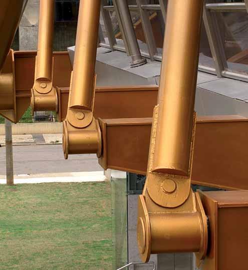 painéis laminados refletivos de 10 mm. As peças foram encapsuladas em silicone sobre a estrutura formada por anéis de aço. Além de fundamental para vencer o grande vão, o material foi escolhido por sua eficiente interface com a caixilharia de vidro.