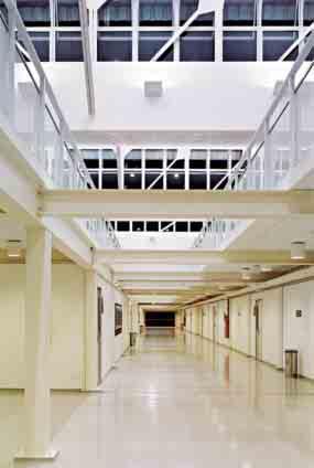 em um tapete luminoso e colorido aos pés de quem percorre o piso transparente. “O aço estabelece a ligação entre o passado e o presente da construção”, explica Loeb, referindo-se especificamente à grelha metálica do piso e às chapas brancas de tela perfurada que revestem lateralmente o ambiente. O átrio hoje ocupa um espaço que, no passado, correspondia ao antigo poço de ventilação e iluminação do prédio. O revestimento metálico e a vedação de vidro estão fixados em uma estrutura composta por perfis e montantes metálicos brancos, presos às paredes originais do edifício.