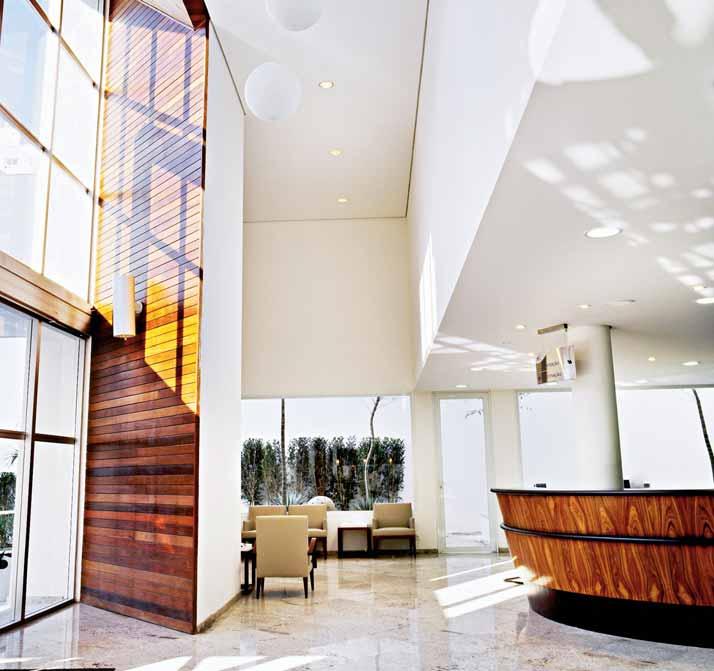 No térreo,o hospital ganhou uma nova área social,com recepção, sala de espera e cafeteria.Sofisticado e acolhedor,o hall de entrada conta com pé-direito duplo,farta iluminação natural e detalhes em madeira,fazendo contraponto ao piso em granito polido. Segundo Sergio Reis,a concepção dos espaços foi norteada pela preocupação com o bem-estar dos pacientes e visitantes.“Cada vez mais os hospitais se diferenciam daqueles prédios que conhecíamos,com ambientes rígidos e arquitetura impessoal”,analisa o arquiteto,apontando uma tendência irreversível. (C.P.) M