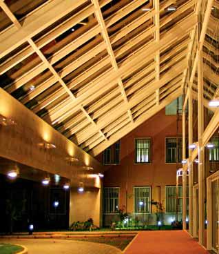 Na fachada,como explica Miguel Elias Filho,engenheiro civil, especialista em estrutura metálica que trabalhou na obra,foi utilizado um sistema misto:pilares e vigas metálicas com dois perfis enrijecidos em U e soldados formando um tubo quadrado,criando os pórticos.Sobre esta estrutura,com perfis mais esbeltos de steel frame,resistentes à corrosão foram sobrepostas chapas cimentícias com acabamento em pintura texturizada.Este sistema também permitiu que a cobertura ganhasse tempo e economia.“A partir das vigas de aço foi possível criar uma laje em steel deck,que foi soldada às próprias vigas.Isso dispensou a armação.Depois foi só fazer o acabamento com concreto”,comenta o engenheiro.
