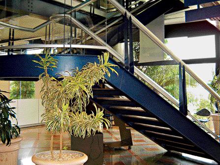 A ampla utilização do aço nas instalações da Açotubo,tanto na área fabril quanto na administrativa,reforça uma das características mais conhecidas e valorizadas deste material no campo da arquitetura:a versatilidade. (V.S.) M