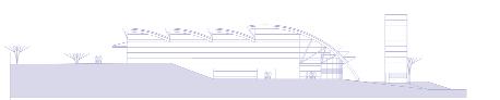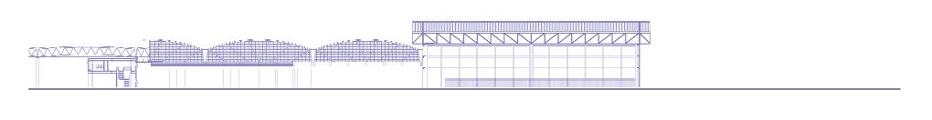 telhas de aço fixadas na estrutura metálica,que atinge 20 m de altura.Para “quebrar”a verticalidade do galpão,foram usados dois tipos de perfil de telha com a mesma cor.“Esta solução permite grande flexibilidade nas expansões”,afirma o arquiteto. Para o bloco administrativo,que abriga de escritórios e posto bancário até dependências da Receita Federal,foi criada uma cobertura metálica apoiada em pilares redondos implantados no nível do galpão,ou seja,1,30 m acima das vias laterais.Segundo Libeskind,a opção pela estrutura em aço veio em função da necessidade de se implantar o entreposto no menor prazo possível. (I.G.) M