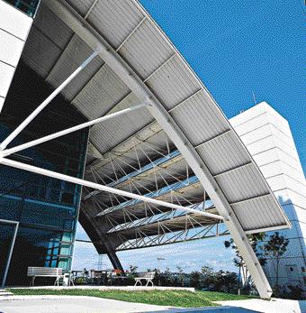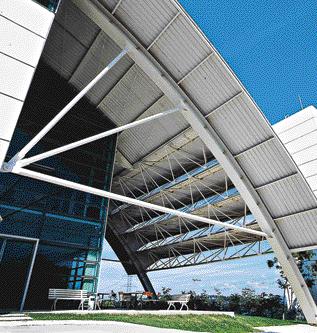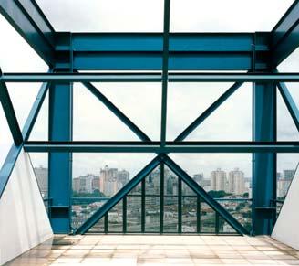 COM TRELIÇAS APARENTES o edifício administrativo da Metasa,construído em 1997 na cidade de Marau,RS,passara a compor a identidade visual da companhia.O aço utilizado em toda a estrutura foi o ASTM A36,pela melhor relação custo x benefício e por ser um recurso abundante na empresa – que fabrica e executa a montagem de edificações em aço em todo o país.Os pavilhões industriais,também projetados em aço,acompanharam a evolução do material e das técnicas construtivas.