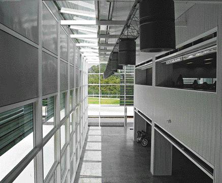Para reduzir o consumo de energia elétrica,venezianas e telhas de PVC translúcido permitem a entrada da luz solar em grandes áreas.Na cobertura, a instalação de sheds favorece a captação do vento norte-sul,mantendo o conforto térmico nos ambientes.O arquiteto Elio Madeira ressalta esse aspecto:“em uma região em que os picos de temperatura chegam a 40°C, não é necessário utilizar luz elétrica nem sistemas de ar-condicionado das 7 às 17 horas em quase todos os setores da fábrica”. (C.P.) M
