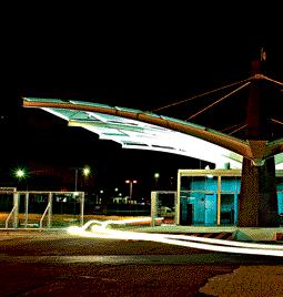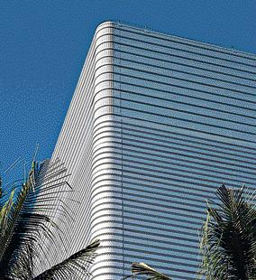 As múltiplas possibilidades do aço também foram exploradas nos revestimentos da fachada,na cobertura curva do estacionamento de caminhões e em uma escada vazada em grade metálica, no centro do lobby