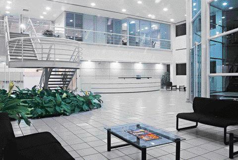 A área administrativa, construída em estrutura metálica, é o módulo que define a resolução plástica do projeto. No lobby, um grande pano de vidro privilegia a iluminação natural e confere amplitude aos espaços