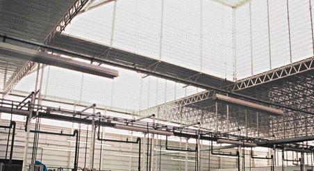 por meio de tirantes metálicos, eliminando a necessidade de pilares intermediários e permitindo a criação de grandes vãos 3. Devido à utilização do aço como material construtivo, a obra pôde ser executada com limpeza e rapidez 4. O PVC translúcido, aplicado em telhas da cobertura e em venezianas da fachada, permite a entrada de luz natural no interior da fábrica 5. Orientados linear e paralelamente, os diferentes volumes da implantação se harmonizam e confirmam a unidade do conjunto arquitetônico