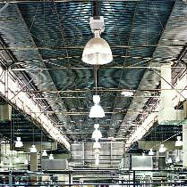É justamente a cobertura metálica que confere destaque ao complexo fabril.Com perfis tubulares,sua estrutura é configurada em três apoios,que saem dos pilares,vencendo um vão de 60 m.O aço pode ser conferido,ainda,em elementos como as passarelas que circundam a área de produção.