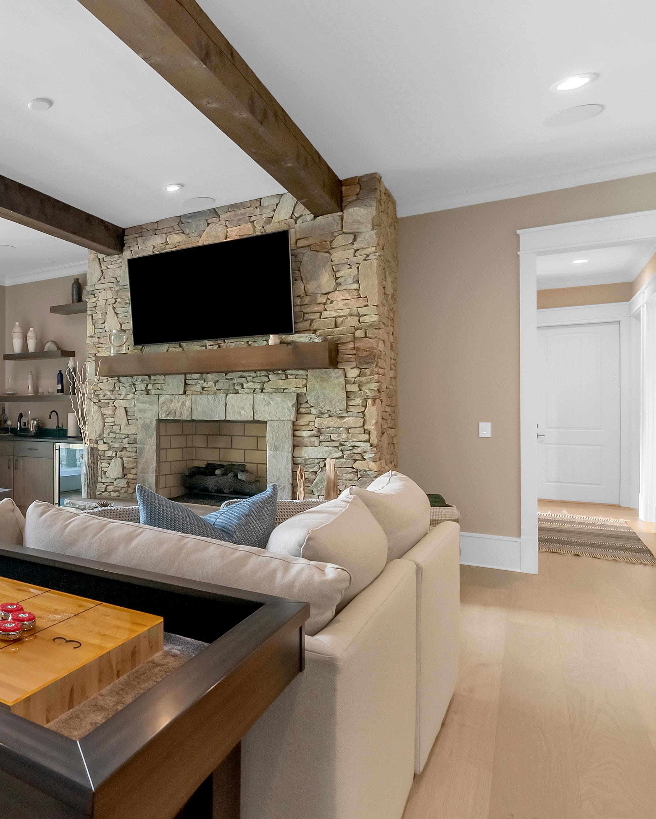The terrace level is designed for both comfort and entertaining, providing three ensuite bedrooms, a family room with stone fireplace, and a large wine room. Outdoors, a flagstone patio leads to a private covered dock with boat lift and dual jet ski docks, as well as a lakeside fire pit with built-in seating. An additional covered patio with stone fireplace, television, and direct pool access creates a second outdoor gathering space ideal for hosting.