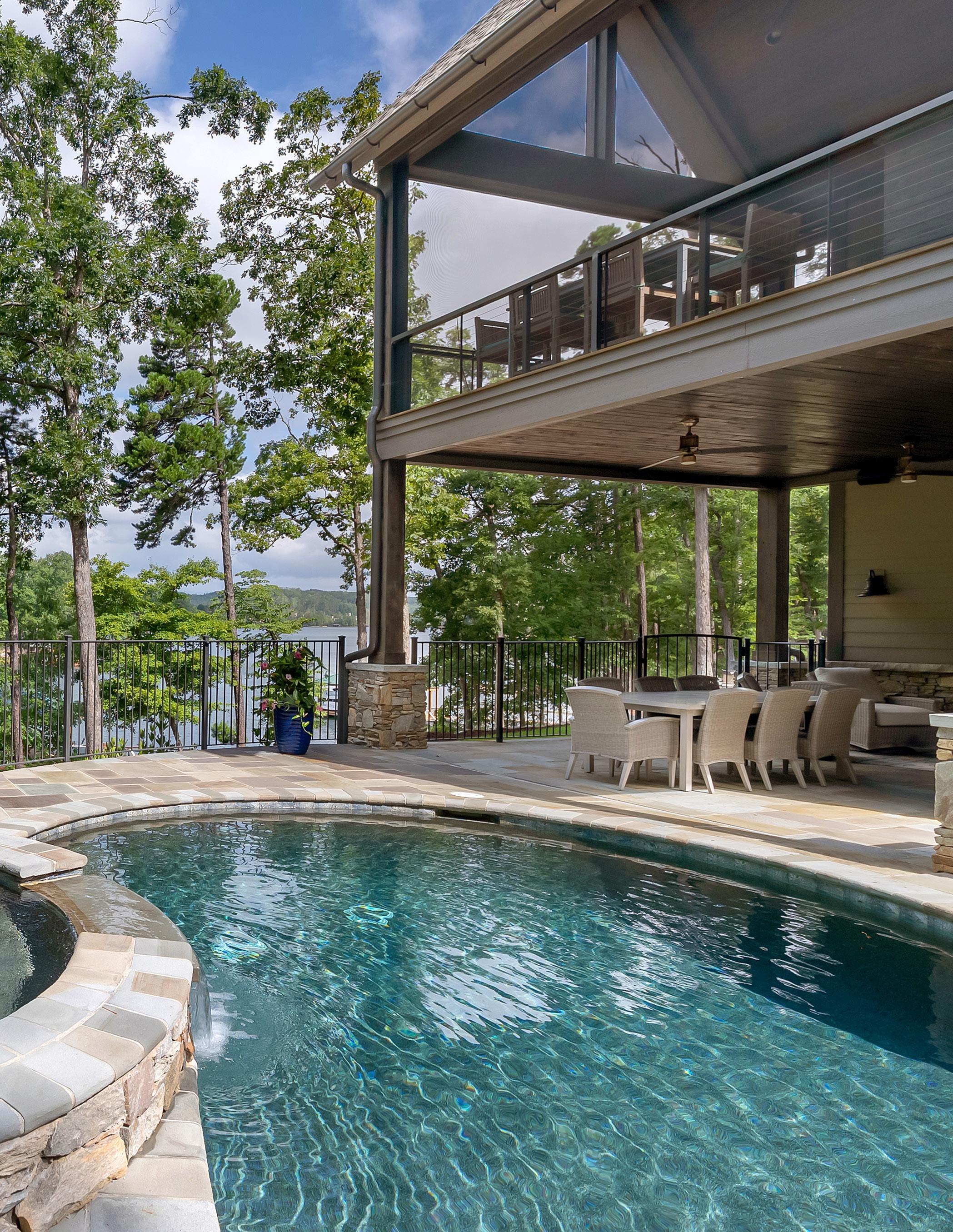 Designed to capture water views from nearly every room, the open-concept main level centers around a chef’s kitchen appointed with premium appliances, an oversized island, and a generous walk-in pantry. The adjoining dining area opens to a covered outdoor living space featuring a built-in grill with exhaust hood and stone fireplace — all overlooking the infinity-edge pool and spa, where a cascading waterfall creates a striking focal point against the lake backdrop.