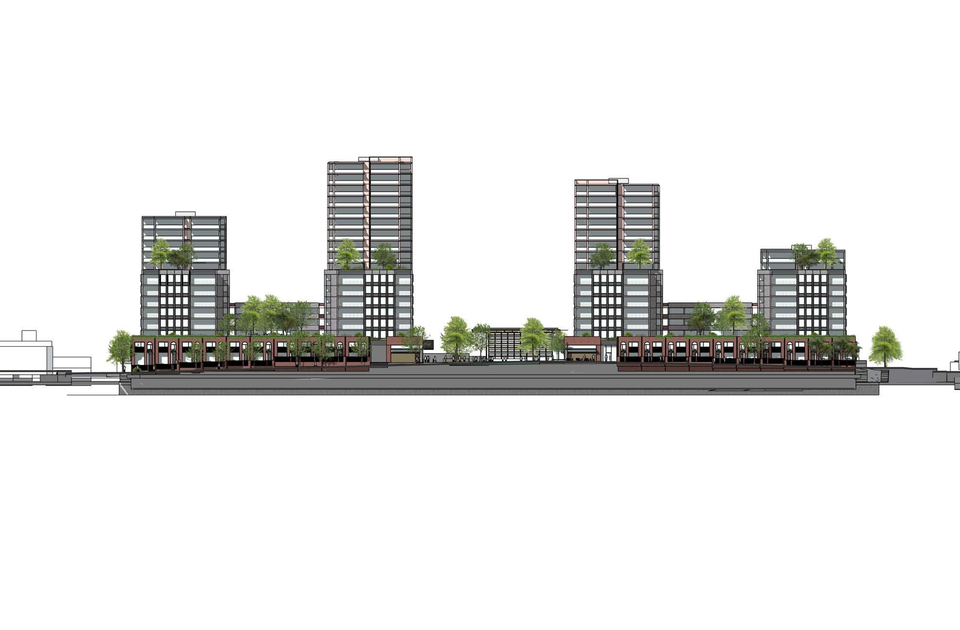 Concept sketch looking to the north east, of Frost Lane with its activated frontages and the interface with the Public Square.
