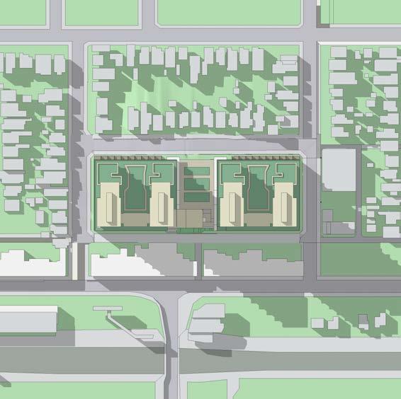 The design consists of four block aligned northsouth. This configuration permits the East,North and West facades to receive in excess of two hours winter sun per day. The reference design achieves 88.3% of units receiving 2hrs winter sun.