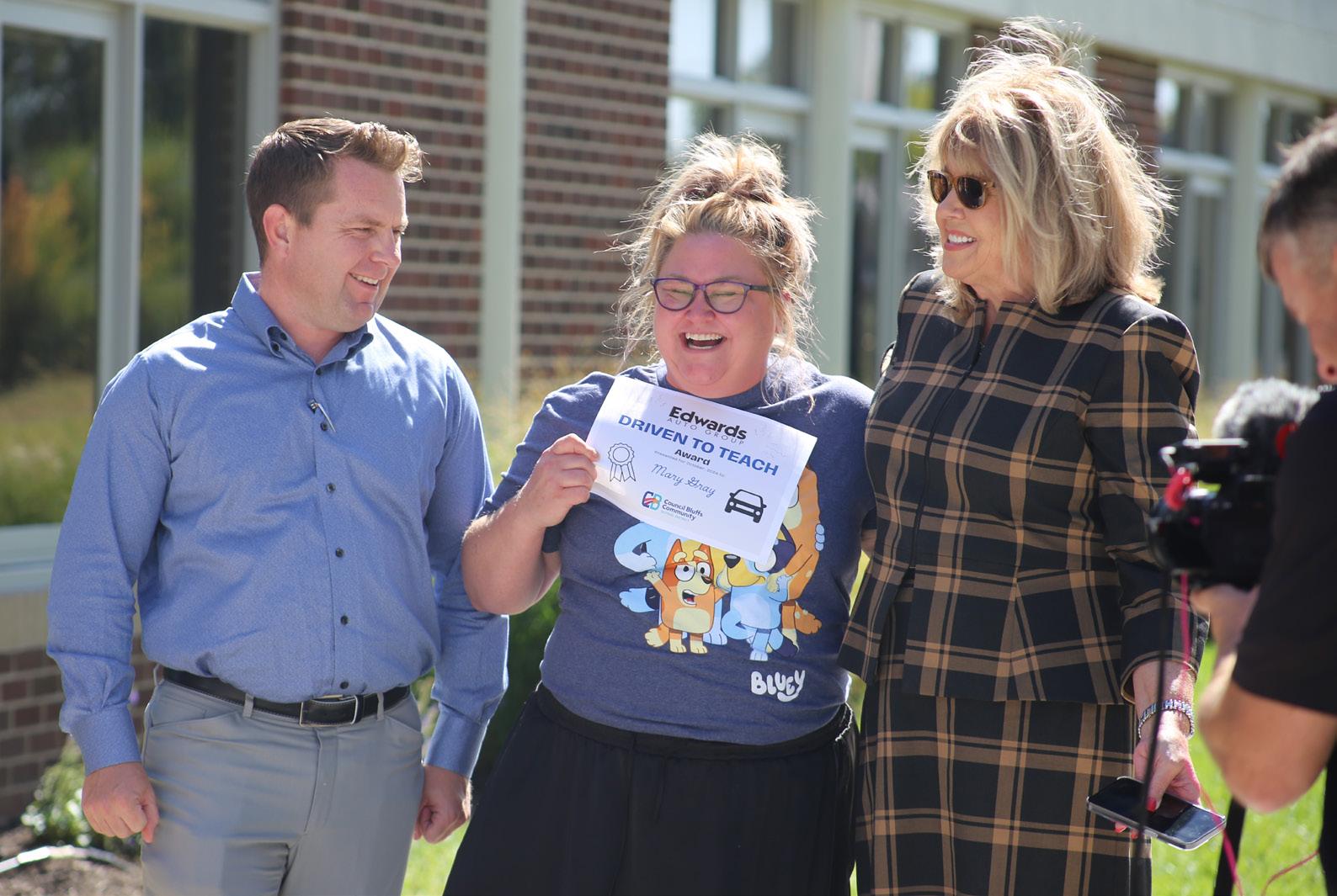 The sixth grade science teacher at Wilson Middle School had her name announced in front of all of her colleagues outside the school to be the inaugural beneficiary of Edwards Auto Group’s new Driven to Teach recognition program.