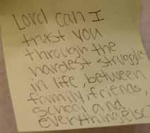 The next morning, the youth found each of their names on another banner. After a message reminding them to trust in God in spite of their questions, they were also challenged to accept God’s trust in them. Church group by church group came to the banner to find and take their post-it with their name on it, to reveal behind all those post-its the word “GOD.” The retreat was planned by a group of youth ministers around the Message’s translation of Proverbs 3:5-6, “Trust God from the bottom of your heart; don’t try to figure out everything on your own. Listen for God’s voice in everything you do, everywhere you go; he’s the one who will keep you on track.”