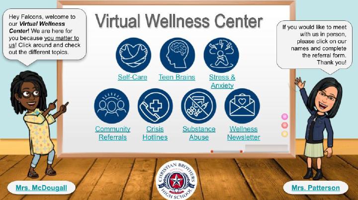 The Wellness Counselors are launching their Virtual Wellness Center. It is a site where students can access information related to self-care, teen brain development, anxiety, stress, community referrals, crisis hotlines, substance abuse, and the weekly wellness newsletters. Another added feature is that you can click on the either Mrs. McDougall or Mrs. Patterson’s name to request an appointment. The Virtual Wellness Center can be found on the Wellness section of the Counseling Department site or by clicking here. Tap on the photo below to head directly to the Virtual Wellness Center.