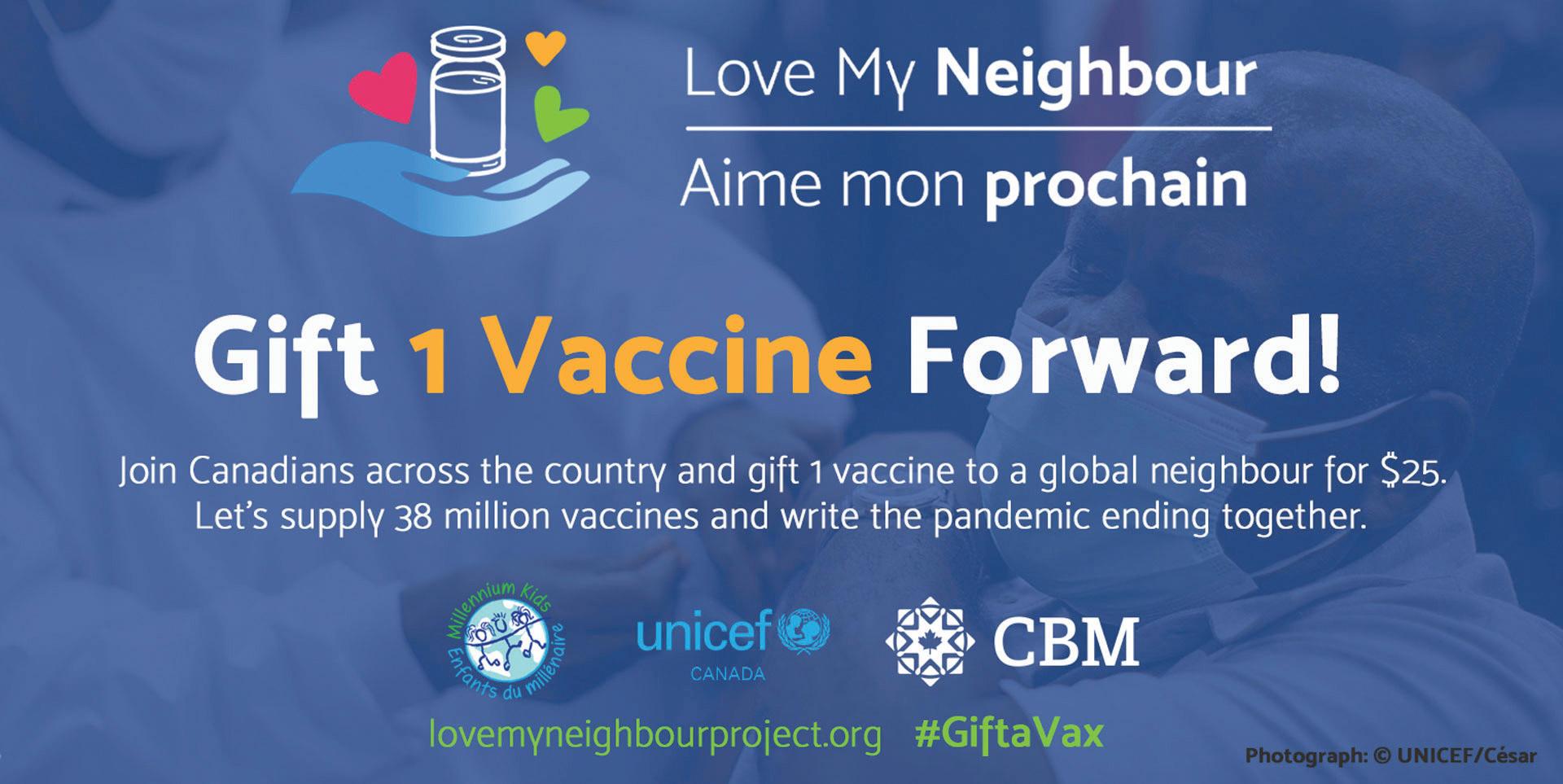 As an expression of gratitude for the vaccines that Canadians will receive in 2021, we are joining Love My Neighbour, a national movement for global vaccine equity inspired by Millennium Kids and Canadian faith communities, to gift forward vaccines to vulnerable populations around the world.