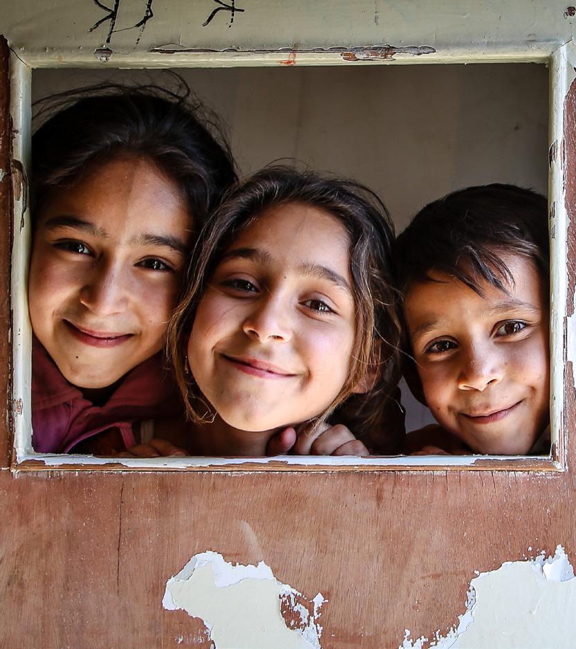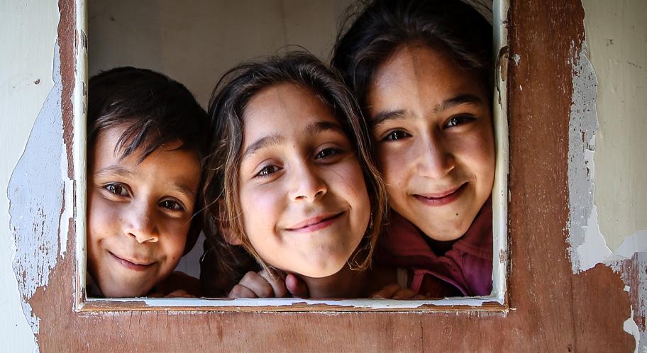 Three of Wafah’s children smile as staff visit their home to distribute a monthly food basket and other essential supplies.