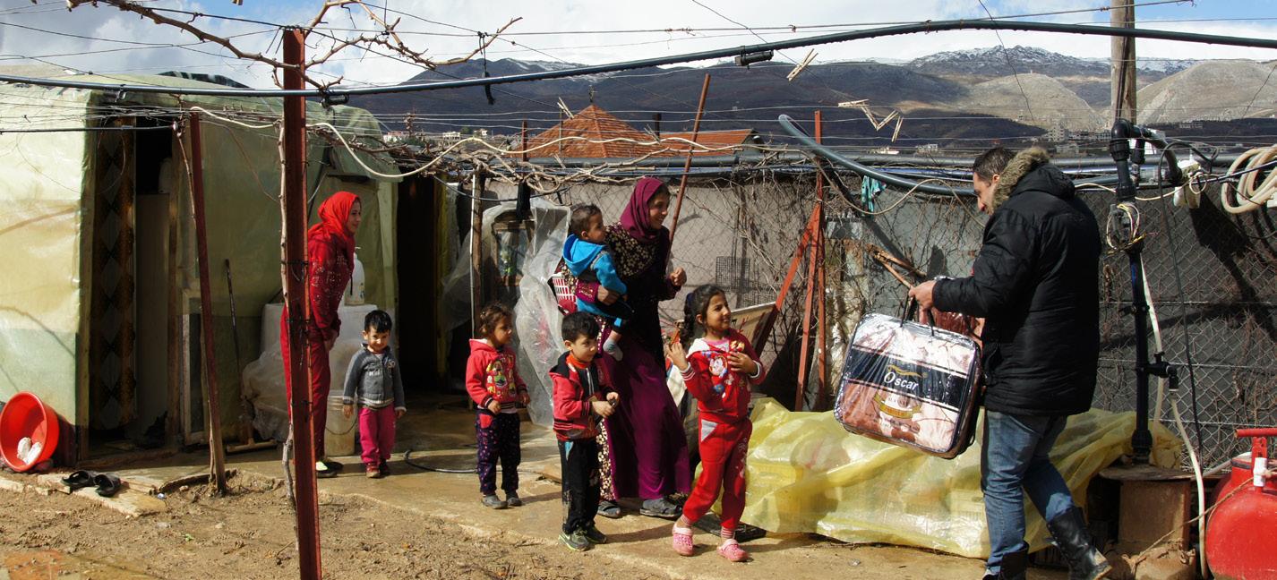A Syrian family living in a refugee camp steps out of their shelter to receive monthly food supplies and other essential items like blankets.