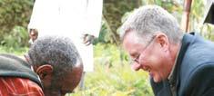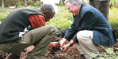 Gordon King (right), Director of The Sharing Way, plants a seedling at one of the Africa Brotherhood Church community development projects in Kenya.