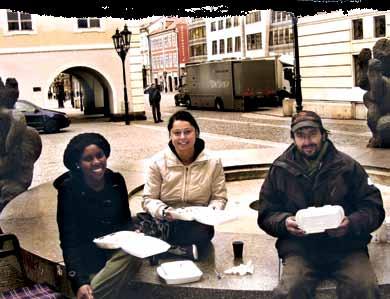 Tasha Schoultz (middle), sharing a meal with a homeless man on the streets of Prague.