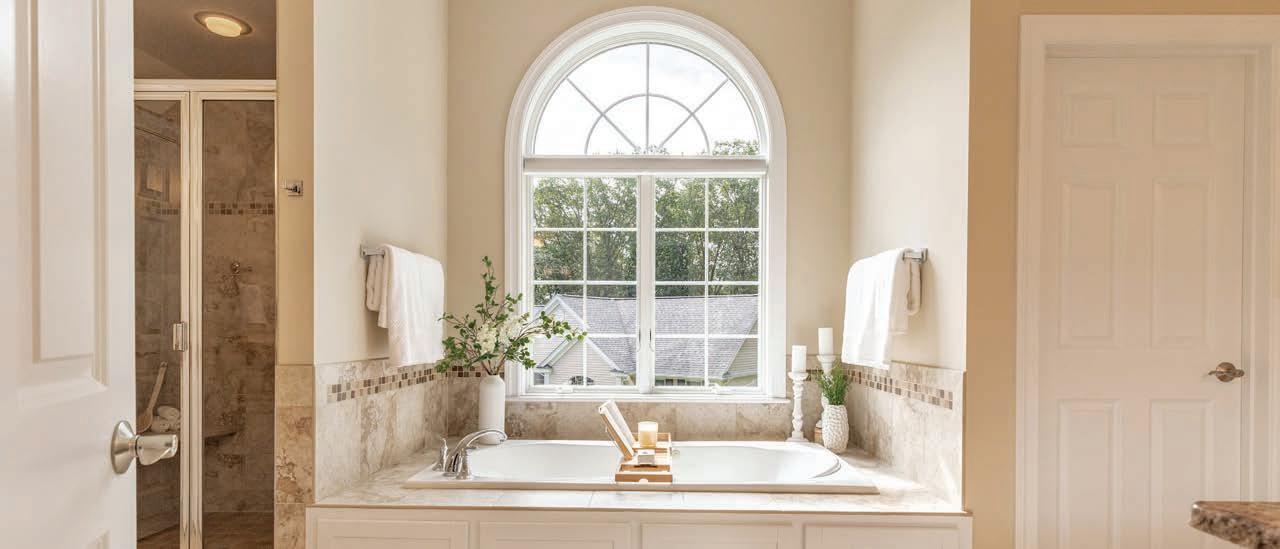 ⚬ Luxurious alcove featuring a jetted Gerber® tub set in a beige tile platform with decorative small-tile inlay, tucked beneath an oversized Palladian window with Levelor® honeycomb blind
