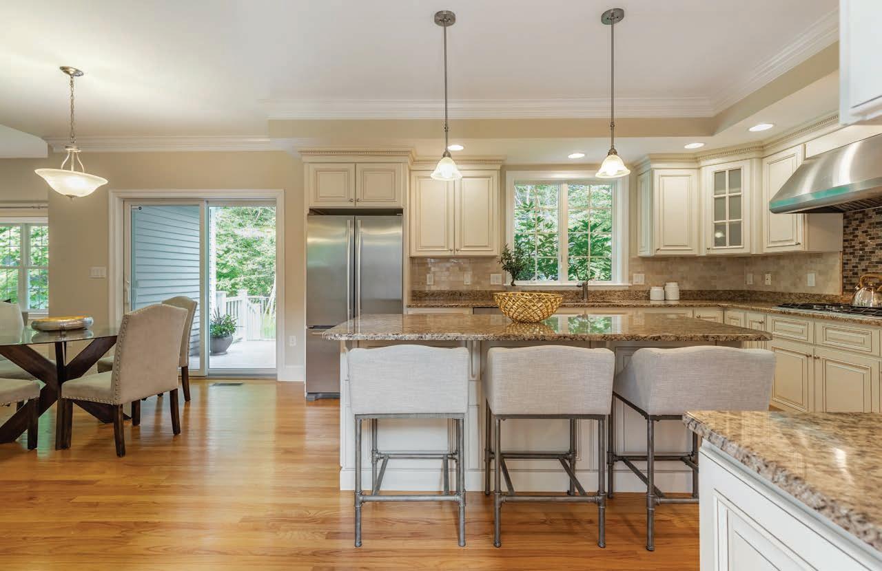 • Expansive coordinating central island with storage, seating for 3, and brushed chrome pendant lighting